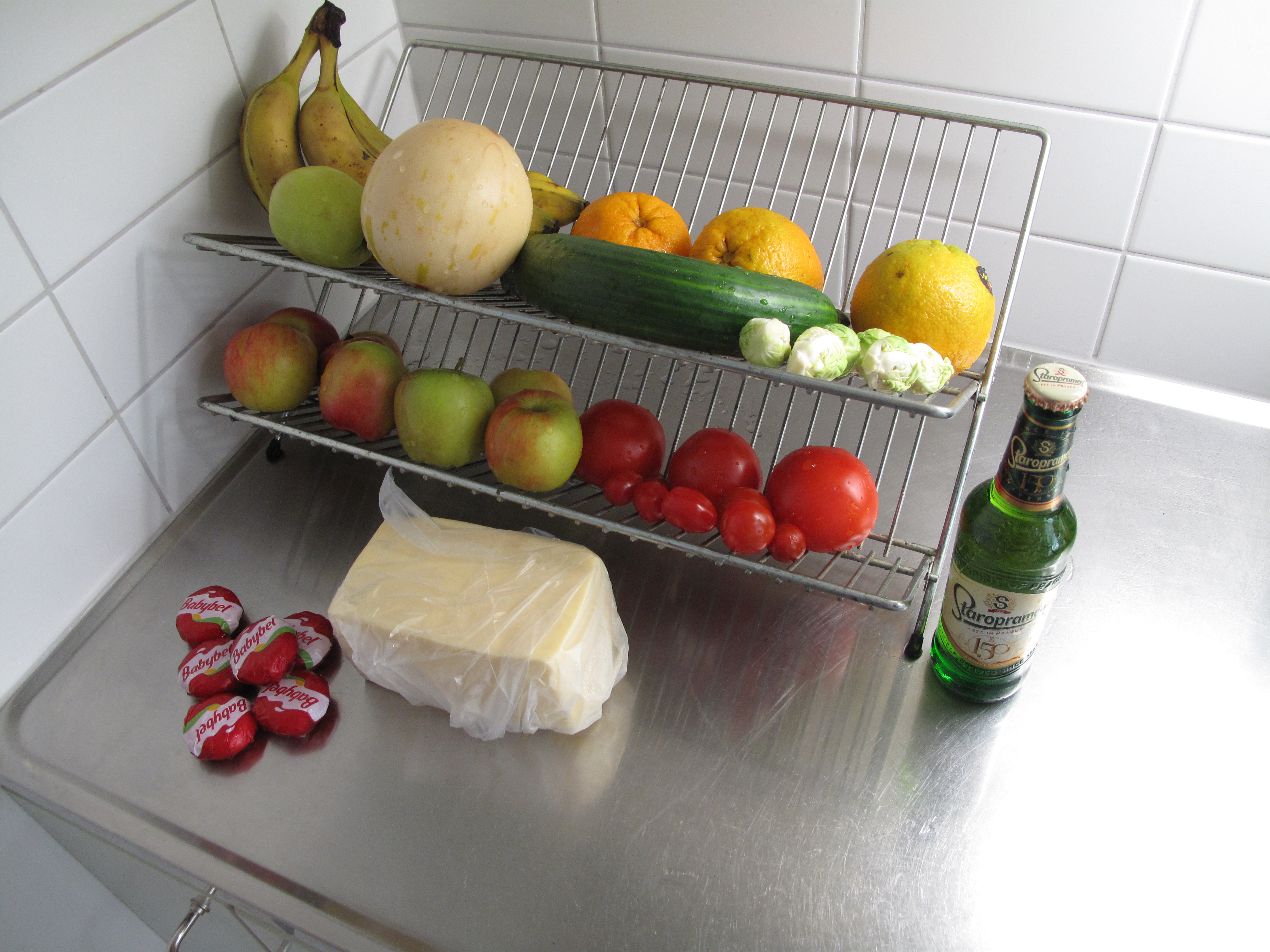 Jag trodde ju att jag hade tagit hem tillräckligt för att vi skulle klara oss fram till semestern, men det är hård åtgång på frukt här hemma. Så jag tog en väldigt restriktiv snabbvända bara för att fylla på fruktskålen. Men som oftast blev det lite mer än tänkt. Några tomater till en pizza-sås, en gurka för att inte riskera att det tar slut. Och så kan man ju naturligtvis inte lämna ost och öl i soporna.