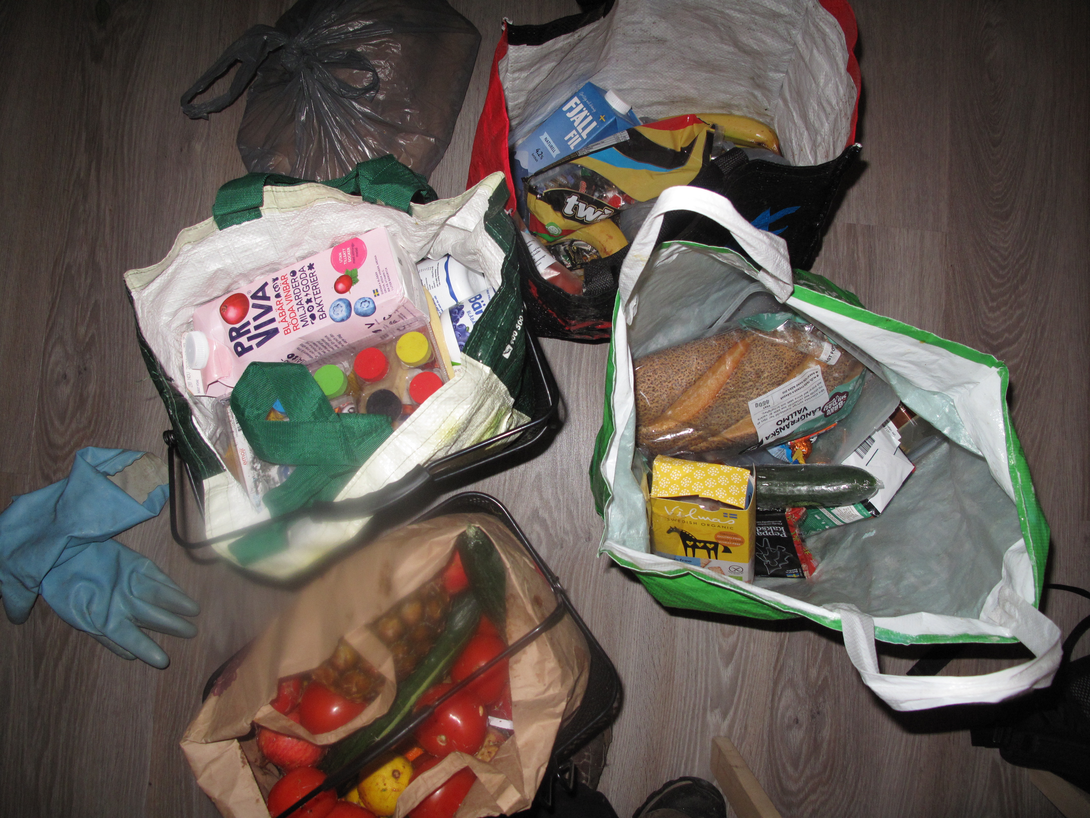 Här är vad jag valde att ta hem från en sväng med cykel till två butiker. Folköl (som vanligt fem), yoghurt, fil, oliver, lupinbönor, ost, godis och massor av frukter och grönsaker. Efter över åtta år av dumpstrande blir jag ju inte chockad så lätt längre, men känslan av vanmakt går inte över. Vanmakten över att det bara fortsätter trots butikskedjornas löften om att deras svinn ska minska (och har minskat, fast det uppenbarligen stämmer illa). Vanmakt över hur det här bara tillåts fortgå utan att det görs något från politiskt håll. Vanmakt över hur lite det är möjligt att rädda på egen hand och att de allra flesta butikers sopor inte ens går att komma åt eftersom de är bakom lås och bom.